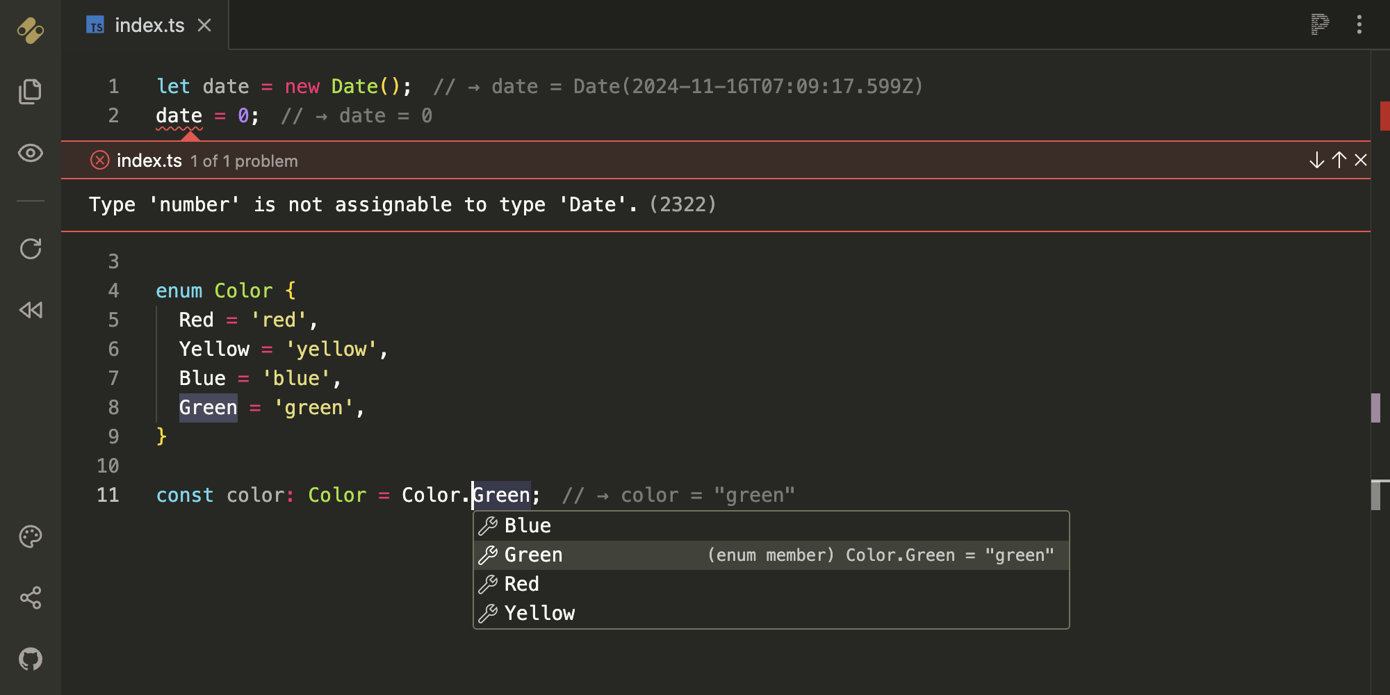 The results of JavaScript and TypeScript expressions are displayed in real time.